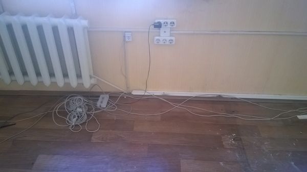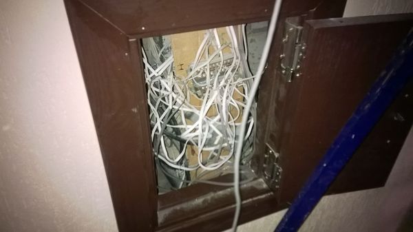 На фото ниже типовая картина, наблюдаемая через каждые два-три помещения. Так выглядит распределительный шкаф ЛВС : ) Каждый день по несколько вызовов об отсутствии сети после того, как помоют шваброй пол.