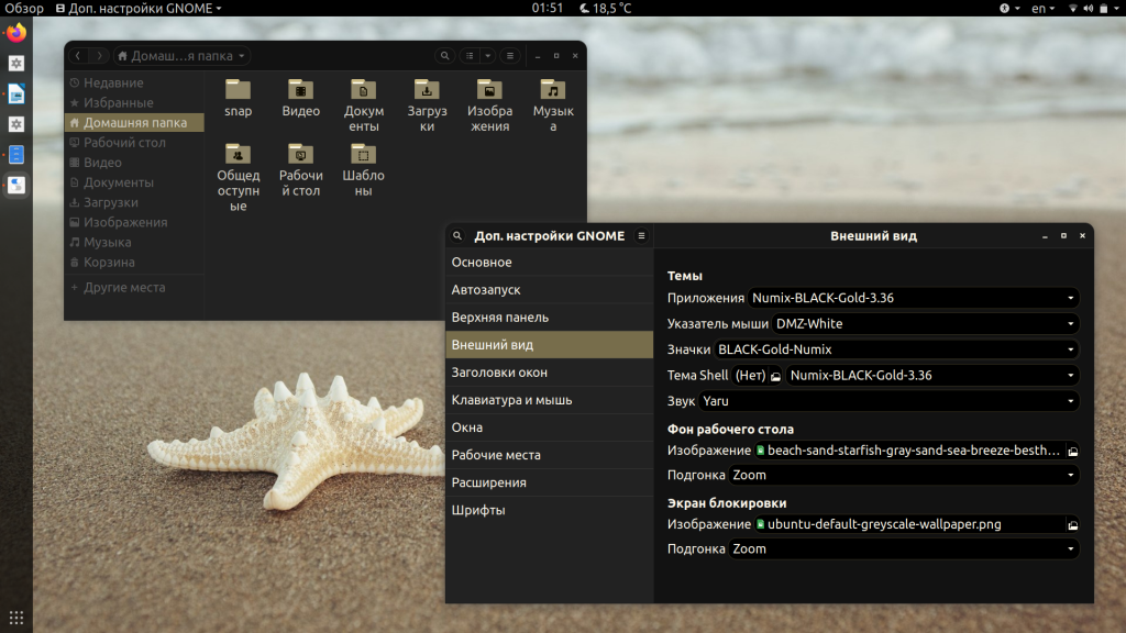 Тема Numix набрала в уже упомянутом голосовании 27% голосов и стала победителем. Впрочем, в своем «первобытном» виде она была актуальной лет 7-8 назад, а сейчас более популярны «ремиксы», созданные на её основе. Один из таких — Numix Black-Gold из набора Numix Black Colors Desktop Superpack.