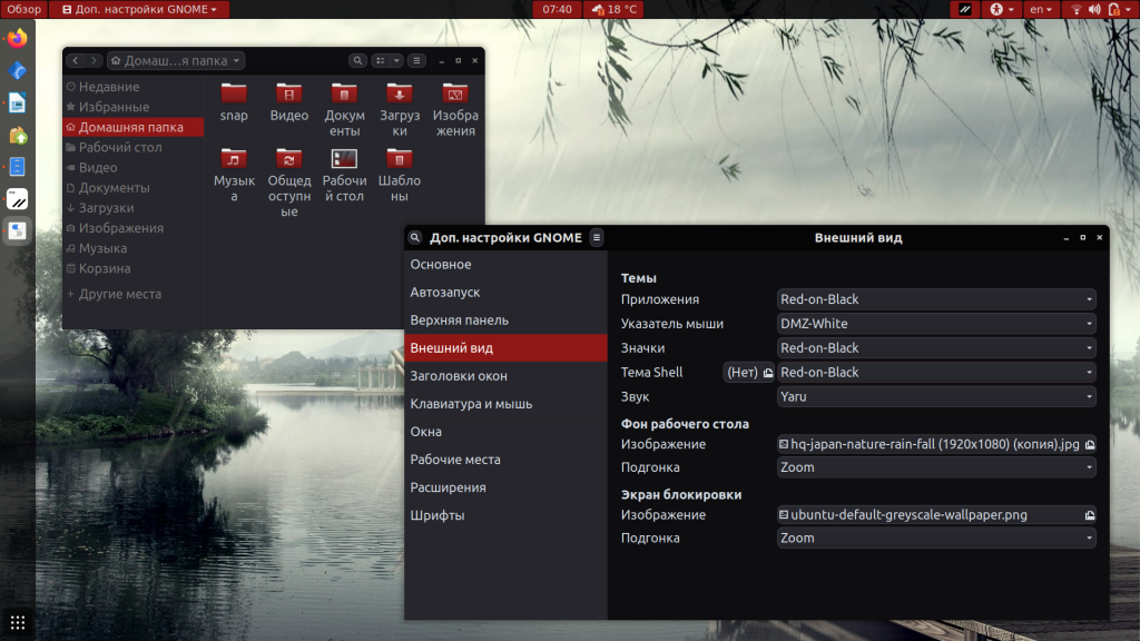 Тёмная тема, в которой используются два фоновых цвета — чёрный и глубокий серый, а также красный для выделений и белый для текста. Окна здесь со скруглёнными углами и едва заметной теневой обводкой, создающей 3D-эффект. Особого внимания заслуживает тема оболочки Gnome Shell — в большинстве дизайнов системная панель оформлена одним цветом, но у Red on Black она двухцветная, все элементы размещены на красном фоне, в то время как основной фон панели черный.