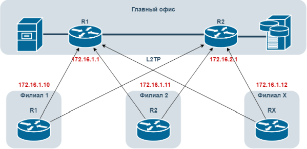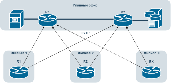 R1 и R2 готовы принимать входящие L2TP подключения
