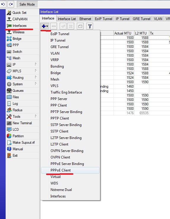 Подключаемся к роутеру через winbox, переходим на вкладку interfaces и нажимаем кнопку плюс
