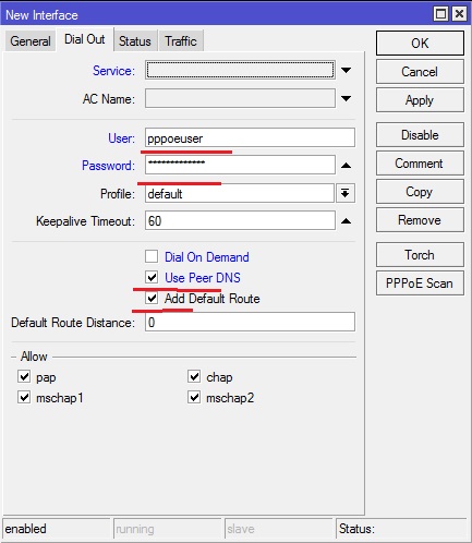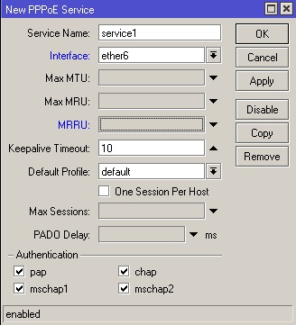 Например если на нашем порту для PPPoE интерфейсе настроена сеть ip 192.168.0.1/24, то в настройках клиента, для безопасности, нельзя выдавать адреса из этой сети. Остальные поля оставляем как есть, нажимаем ОК, теперь можно пробовать подключаться к нашему Микротику по PPPoE протоколу.