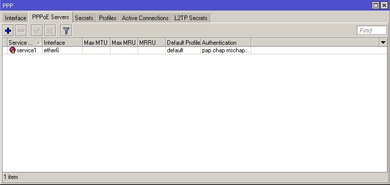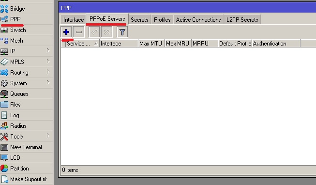 Все настройки будем производить через утилиту winbox. Подключаемся к маршрутизатору. Для настройки PPPoE сервера на Mikrotik заходим в меню PPP вкладка PPPoE Servers, Нажимаем на «+» добавить новый сервер.