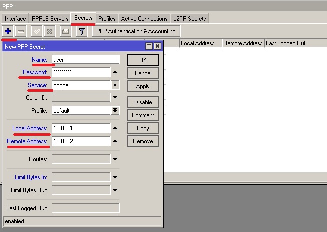 Следующим шагом нам нужно создать пользователей, которые будут подключаться к нашему PPPoE серверу. Для этого переходим на вкладку Secrets и нажимаем добавить. В открывшемся окне заполняем поля как указано на рисунке.