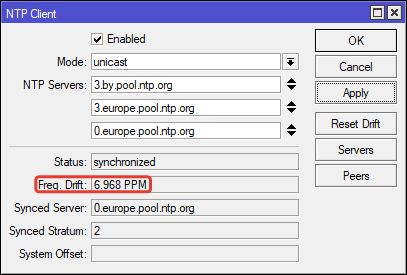 Кнопка Reset Drift позволяет роутеру сбросить значение подстройки синхронизации, вызванную частотным дрейфом и заново начать запоминать частоту тактовых импульсов сервера NTP. Дрейф частоты может возникнуть, например, если роутер переключается с синхронизации с одним сервером NTP на синхронизацию с другим сервером NTP с другой частотой.