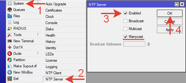 В процессе обслуживания ЛВС возникла необходимость обеспечить синхронизацию времени в большом количестве камер видеонаблюдения. От серверов в Интернете синхронизация почему-то проходила плохо и не всегда. На помощь пришел микротик. В роутере был запущен NTP-сервер для локальной сети, который сам синхронизировался из внешней сети (Интернета) без проблем. Как это все настроить описано далее.