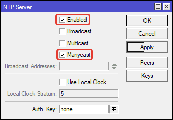 Manycast – режим обмена пакетами между сервером и клиентами — оставляем без изменений.