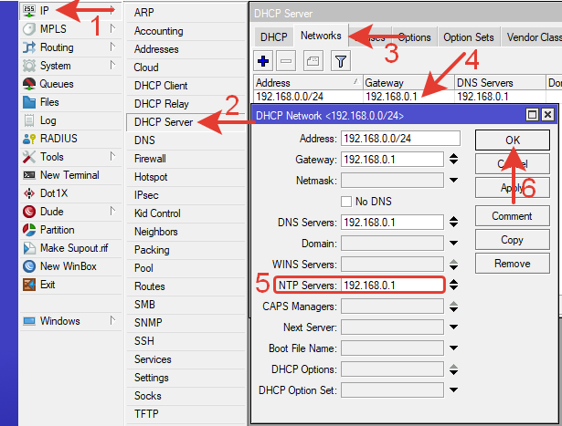 NTP можно динамически раздавать вместе с сетевыми настройками. Для этого в DHCP сервере для локальной сети на вкладке Networks нужно добавить адрес NTP-сервера.