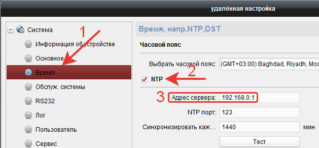 В камерах видеонаблюдения, для которых это все делалось, нет автоматического получения NTP с сетевыми настройками. NTP сервер указывается вручную. Входим в меню настроек камеры. На вкладке «Время» активируем галочкой NTP и указываем IP-адрес настроенного ранее локального сервера.
