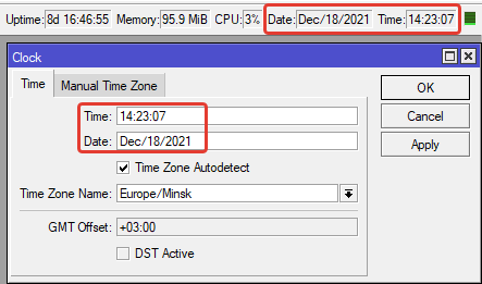 Клиент настроен, время в роутере актуальное. Проверить его можно на вкладке System >> Clock или вынести на переднюю панель в верхней правой часть окна WinBox.