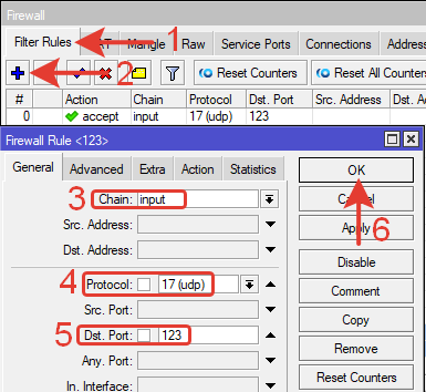 NTP работает через порт 123 UDP. Если по каким-то причинам Firewall не пропускает трафик по этому порту, то его нужно открыть правилом в IP >> Firewall >> Filter Rules.