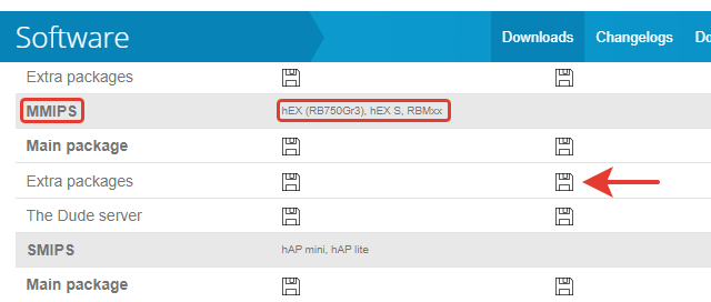 Находим на сайте mikrotik.com в разделе software прошивку для своей архитектуры и модели роутера. Выбираем и скачиваем Extra Packages.
