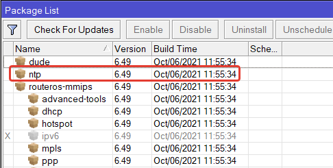 Использован роутер RB750Gr3 c прошивкой v6.49. Пакет NTP-сервера не входит в базовый состав прошивки, его нужно скачивать отдельно. В прошивках версии v7.0 и выше пакет NTP встроен в главный файл прошивки.