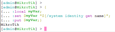 :local myVar; :set $myVar "$[/system identity get name]"; :put $myVar;