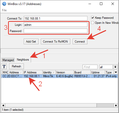 При нажатии на ячейку с IP-адресом, соединение будет выполнятся по IP. Если нажать на MAC-адрес, то подключение к роутеру выполнится по MAC-адресу соответственно.