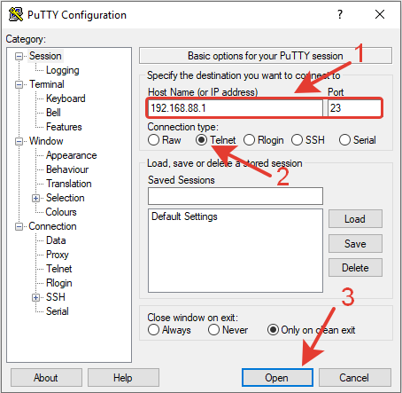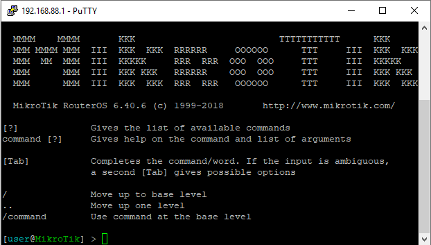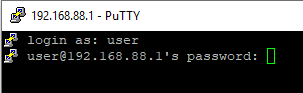 После правильного ввода учетных данных произойдет подключение. Далее управляем роутером через командную строку.
