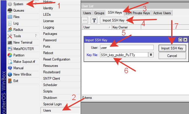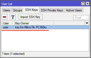 Привяжем ключ к учетной записи. Переходим через боковое меню RouterOS по следующему пути.