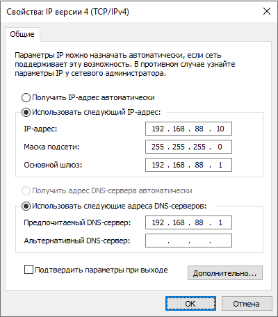 Компьютер с которого выполняется подключение находится под управлением ОС Windows. Он должен быть в одном IP-диапазоне с роутером. Для этого в сетевом адаптере ПК указываем 192.168.88.10.
