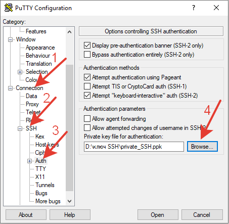 Запускаем PuTTY, в боковом меню переходим по пути: Connection >> SSH >> Auth.