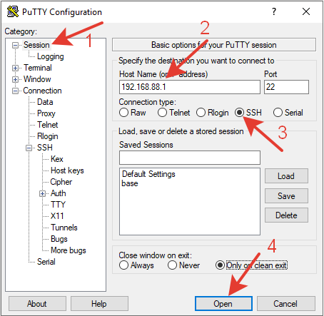 Запускаем PuTTY и добавляем SSH ключ еще раз. Подключаемся к роутеру.