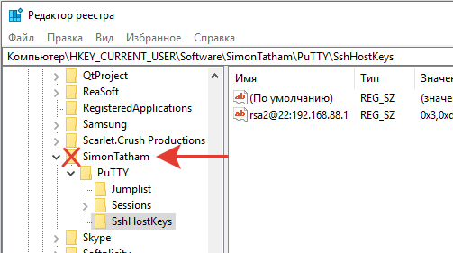 В таком случае удаляем в реестре всю ветку каталогов, связанную с PuTTY.