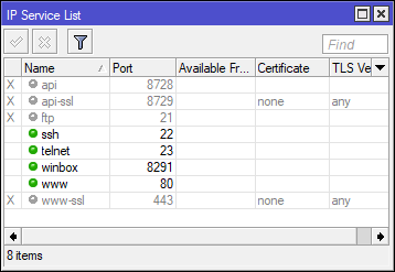 Для использования любого из способов, описанных выше, в MikroTik должны быть активированы доступы к указанным сервисам. По заводской конфигурации в роутере это именно так и есть. Если роутер уже находится в работе, то следует убедиться, что требуемые сервисы активированы. Сделать это можно через боковое меню IP >> Services.
