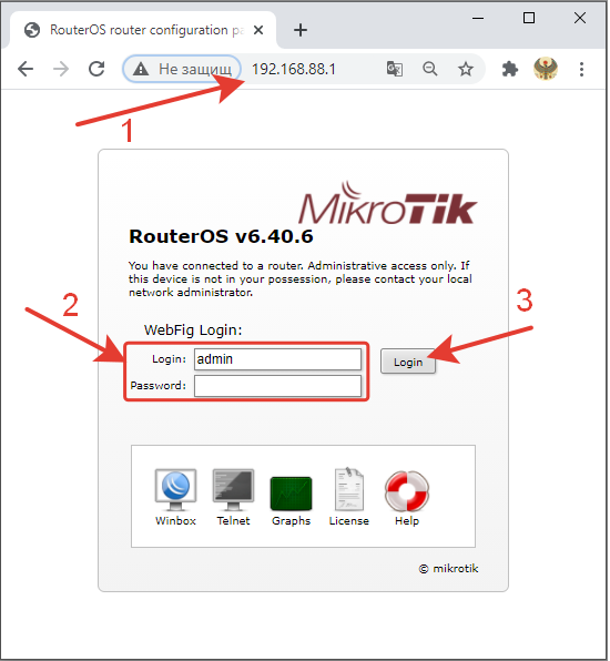 1.Вводим в адресной строке любого браузера IP-адрес роутера: 192.168.88.1 (нажимаем Ввод)