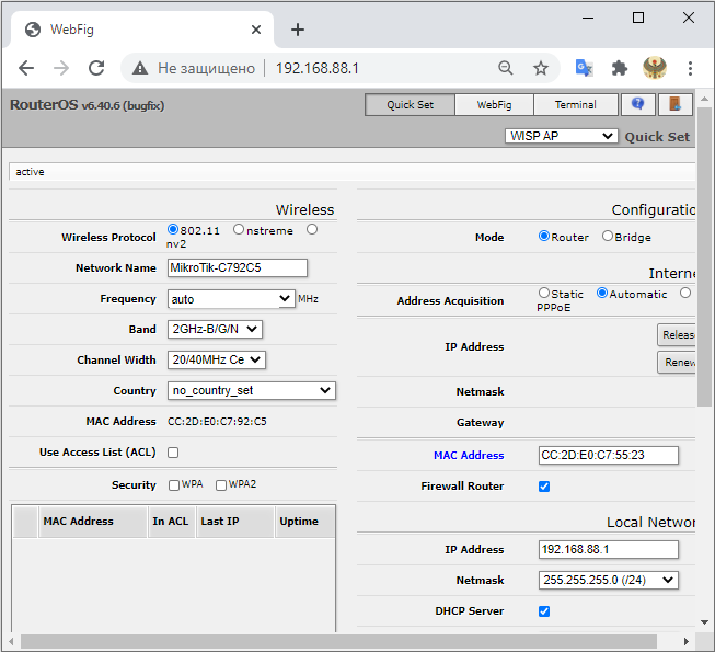 Настройки роутера и компьютера как в предыдущем разделе: роутер сброшен на заводскую конфигурацию, в ПК IP-адрес 192.168.88.10.