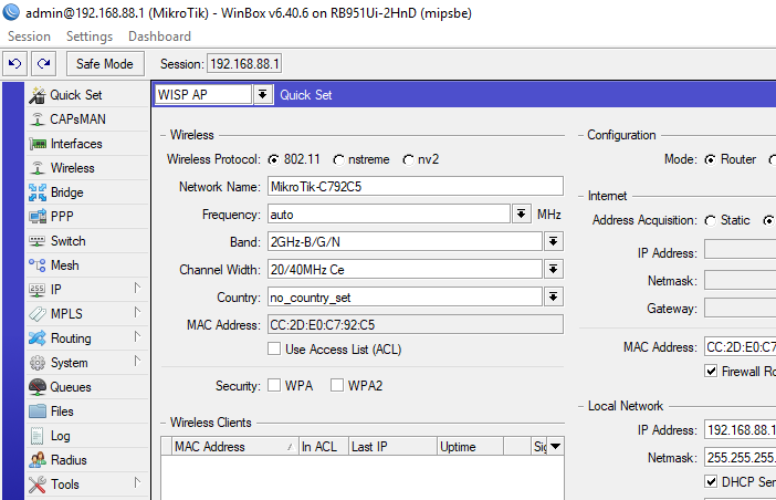 Подключение будет осуществляться к роутеру MikroTik 951Ui 2HnD, который находится в работе в локальной сети нашей организации и лежит за подвесным потолком. Кабель ЛВС подключен во второй порт роутера. Настройки роутера временно сброшены на заводские.