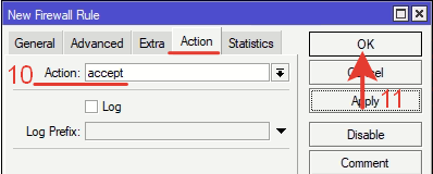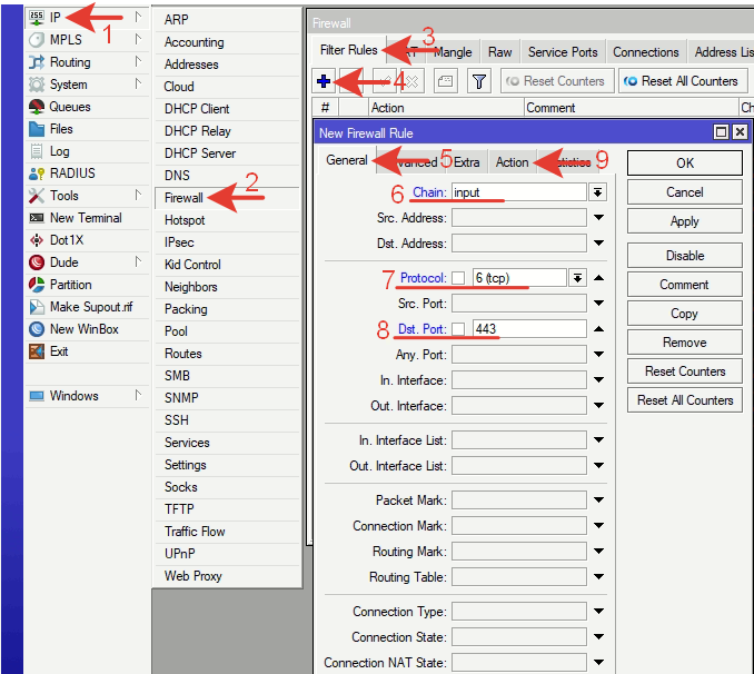 Переходим по меню: IP >> Firewall >> Filter Rules >> +