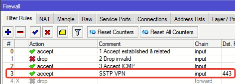 | /ip firewall filter add action=accept chain=input dst—port=443 protocol=tcp comment=«SSTP VPN» |