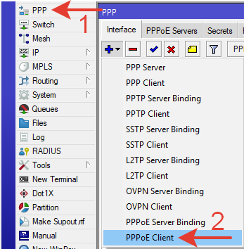 Создаем интерфейс PPPoE клиента: PPP >> PPPoE Client.