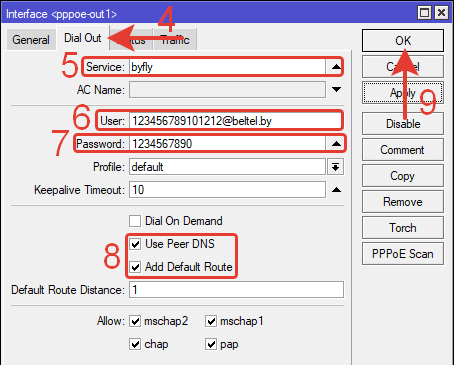 | /interface pppoe—client add name=pppoe—out1 interface=ether1 service—name=byfly user=0987654321111@beltel.by password=1234567890 add—default—route=yes use—peer—dns=yes disabled=no |