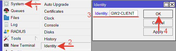 | /system identity set name=GW2—CLIENT |