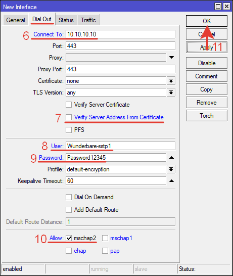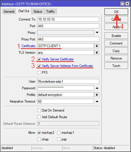| /interface sstp—client add authentication=mschap2 connect—to=10.10.10.10 disabled=no name=SSTP—TO—MAIN—OFFICE password=Password12345 profile=default—encryption user=Wunderbare—sstp1 verify—server—address—from—certificate=no |