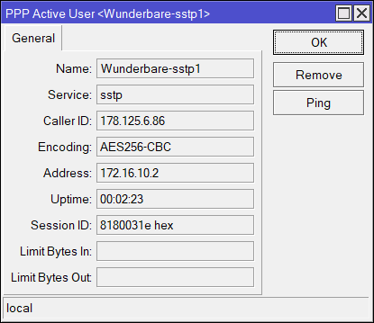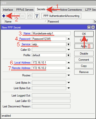 | /ppp secret add local—address=172.16.10.1 name=Wunderbare—sstp1 password=Password12345 remote—address=172.16.10.2 service=sstp |