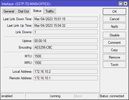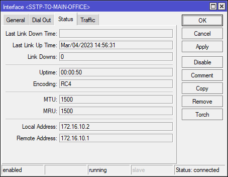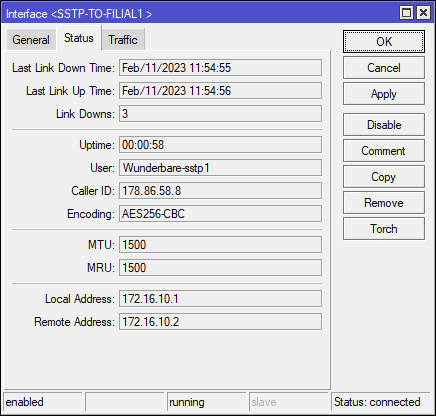 В интерфейсе на сервере можно убедиться в соответствии назначенных ранее Local и Remote Address.