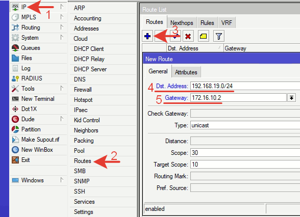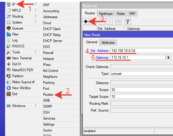 Переходим в меню маршрутов: IP >> Routes >> +