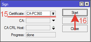 Выбираем сертификат CA, нажимаем кнопку «Start».
