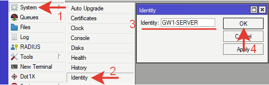 | /system identity set name= GW1—SERVER |