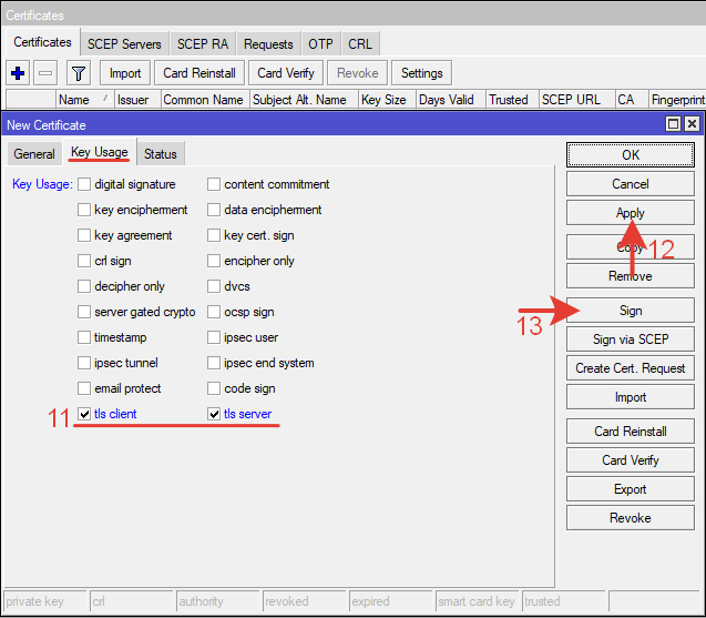 Отмечаем tls client и tls server для использования сертификата на сервере и клиенте.