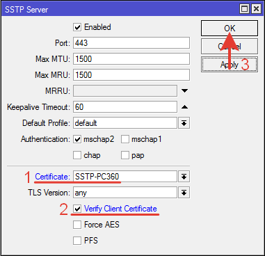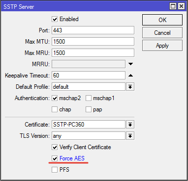 wiki.mikrotik.com сообщает что данный вид шифрования предназначен для работы с клиентами Windows, иначе они не смогут подключится. Так как в нашем случае соединение через роутеры «сайт-сайт», можно применить другой вид шифрования. Настройка выполняется на сервере. Нужно отметить галкой параметр «Force AES».