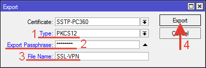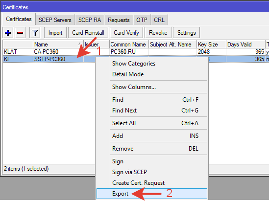 Выбираем сертификат для SSTP и нажимаем «Export».