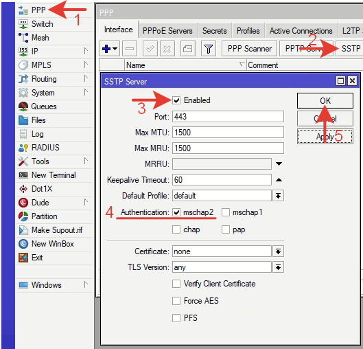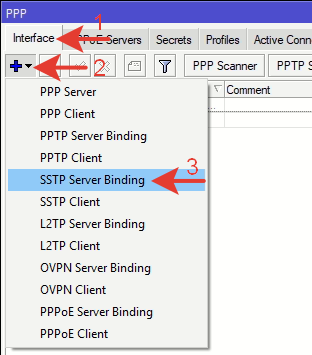 Переходим по меню в: PPP >> Interface >> SSTP Server