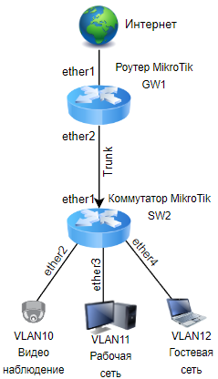По смыслу роутер будет выполнять работу коммутатора. Он будет принимать все три VLAN на первый порт ether1 и раздавать нужный трафик с тэгами 10, 11 и 12 в порты ether2, ether3 и ether4 соответственно.