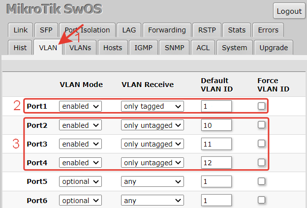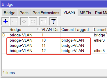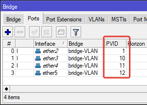 | /interface bridge port add bridge=bridge—VLAN interface=ether2 frame—types=admit—only—vlan—tagged add bridge=bridge—VLAN interface=ether3 pvid=10 frame—types=admit—only—untagged—and—priority—tagged add bridge=bridge—VLAN interface=ether4 pvid=11 frame—types=admit—only—untagged—and—priority—tagged add bridge=bridge—VLAN interface=ether5 pvid=12 frame—types=admit—only—untagged—and—priority—tagged |