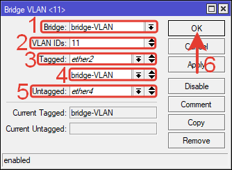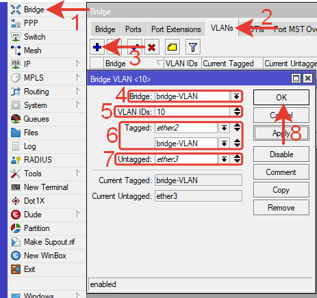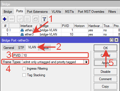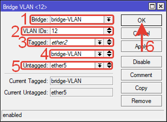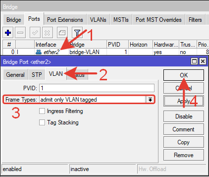 Tagged: ether2, bridge-VLAN – тегированные порты.