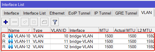 | /interface vlan add name=VLAN—10 vlan—id=10 interface=bridge—VLAN add name=VLAN—11 vlan—id=11 interface=bridge—VLAN add name=VLAN—12 vlan—id=12 interface=bridge—VLAN |