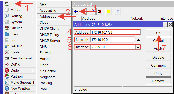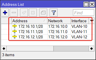 | /ip address add address=172.16.10.1/28 interface=VLAN—10 network=172.16.10.0 add address=172.16.11.1/28 interface=VLAN—11 network=172.16.11.0 add address=172.16.12.1/28 interface=VLAN—12 network=172.16.12.0 |