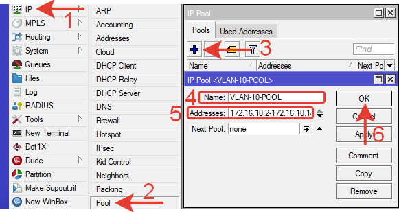 | /ip pool add name=VLAN—10—POOL ranges=172.16.10.2—172.16.10.14 /ip pool add name=VLAN—11—POOL ranges=172.16.11.2—172.16.11.14 /ip pool add name=VLAN—12—POOL ranges=172.16.12.2—172.16.12.14 |